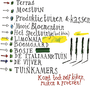 Steeds uitbundiger wordt de tuin in de zomer en in de herfst. Heerlijk ruikende kruiden als tijm, rozemarijn en munt. Tomaten in verschillende vormen en smaken. Aubergines en courgettes. Zomerpreitjes, spitskolen, savooiekool en de spectaculaire zwarte palmkool (cavolo nero). Rode & witte uien, knoflook, ijsbergsla en rode batavia, om maar wat te noemen. Schorseneren, pastinaken en kardoen. En dat alles gecombineerd met bloembedden: Oost-Indische kers, scabiosa, slaapmutsjes, asters, dahlia’s, korenbloemen, zinnia’s en nog veel meer. Langs de paden rozen, lavendel en kattenkruid. Ook langs de paden en vooral langs de zuidmuur groeien de leifruitbomen in kunstige vormen als pauwstaart, kandelaber, palmet en Belgisch hek. Appels, peren, perziken, vijgen en een moerbei. Hier zijn hoveniers aan het werk onder leiding van meestersnoeier Jan Freriks.